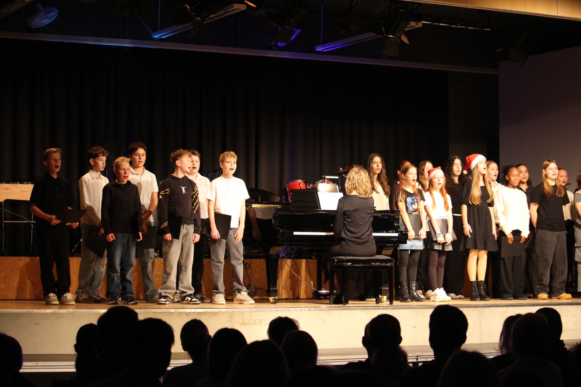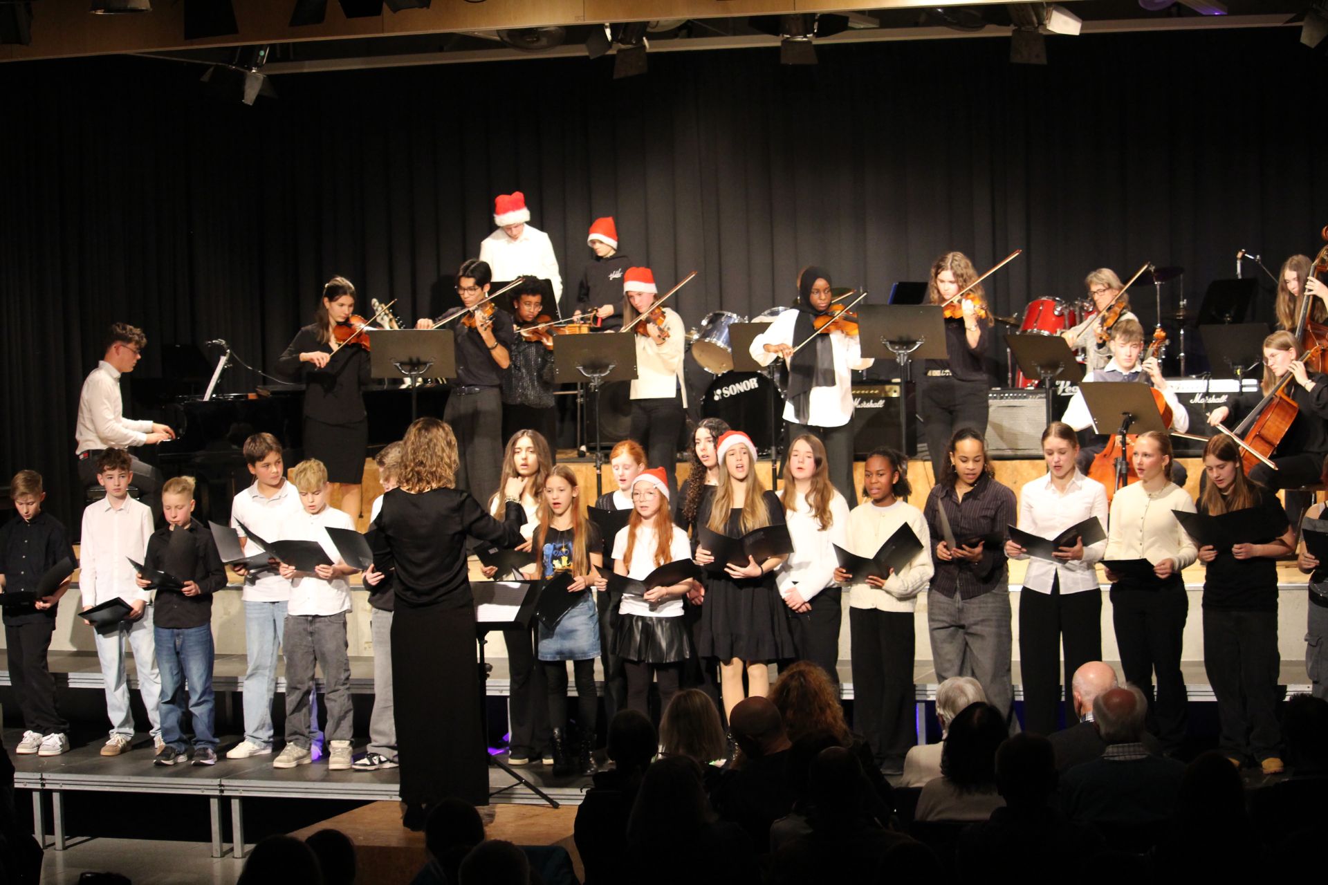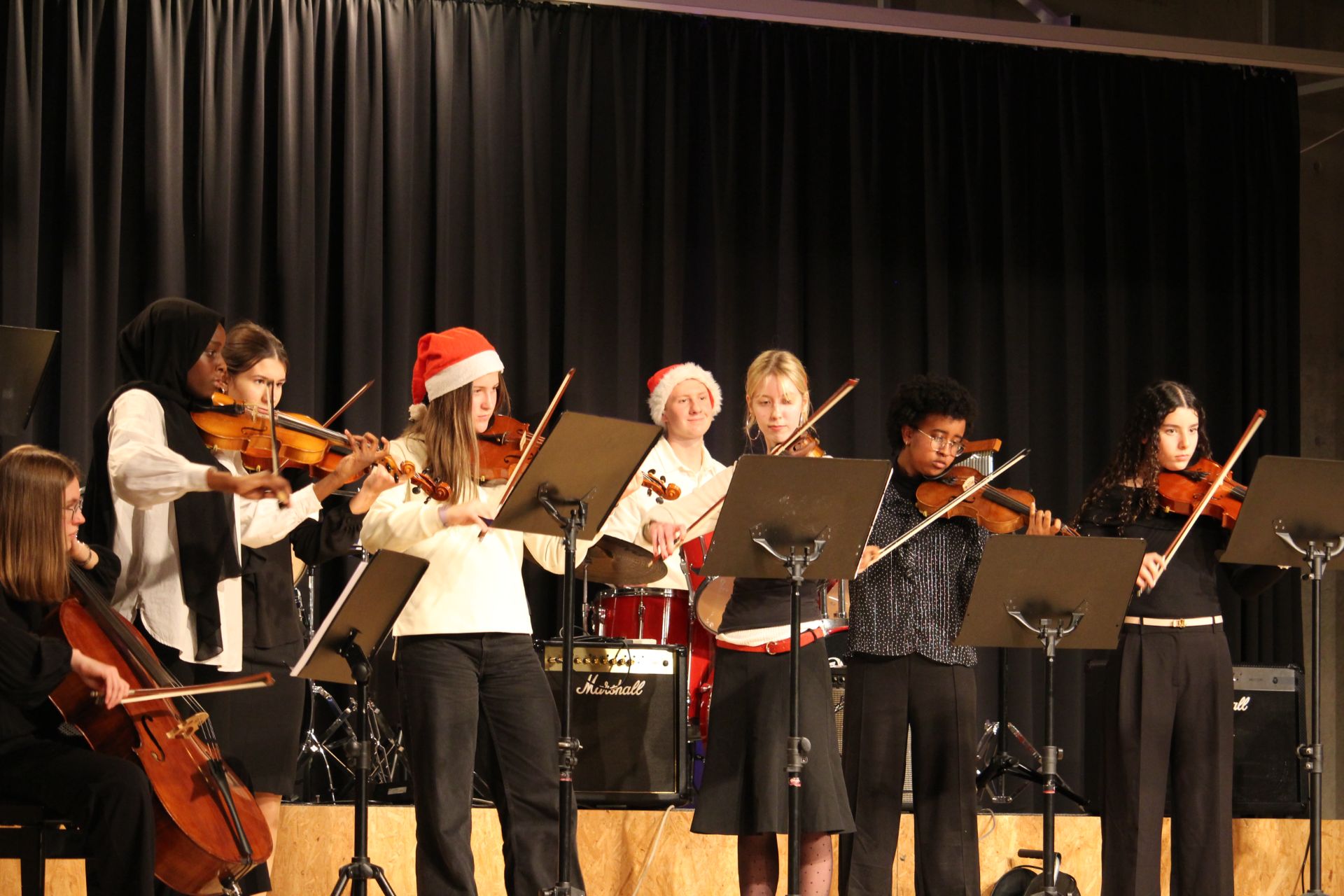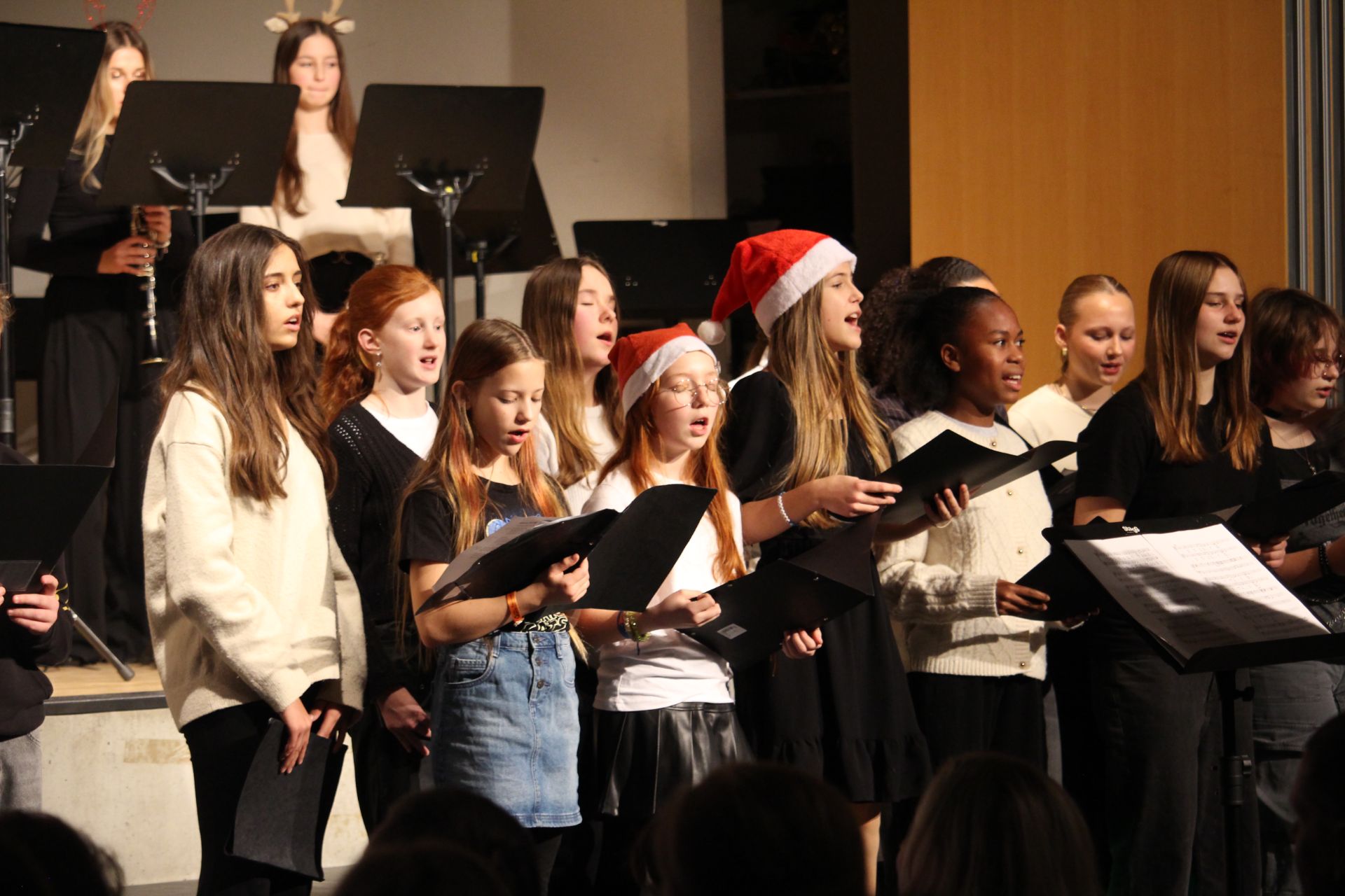 Den Auftakt machte der Unterstufenchor, der mit „Licht der Weihnacht“ und dem vertrauten „We wish you a merry Christmas“ sofort jene Stimmung erzeugte, die man sich in der Adventszeit erhofft: hell, klar und voller Vorfreude. Besonders schön wurde es, als der Chor gemeinsam mit den „Viöhlinis“, der Streichergruppe, „Feliz Navidad“ anstimmte – ein kleines musikalisches Friedenszeichen über Sprach- und Kulturgrenzen hinweg.