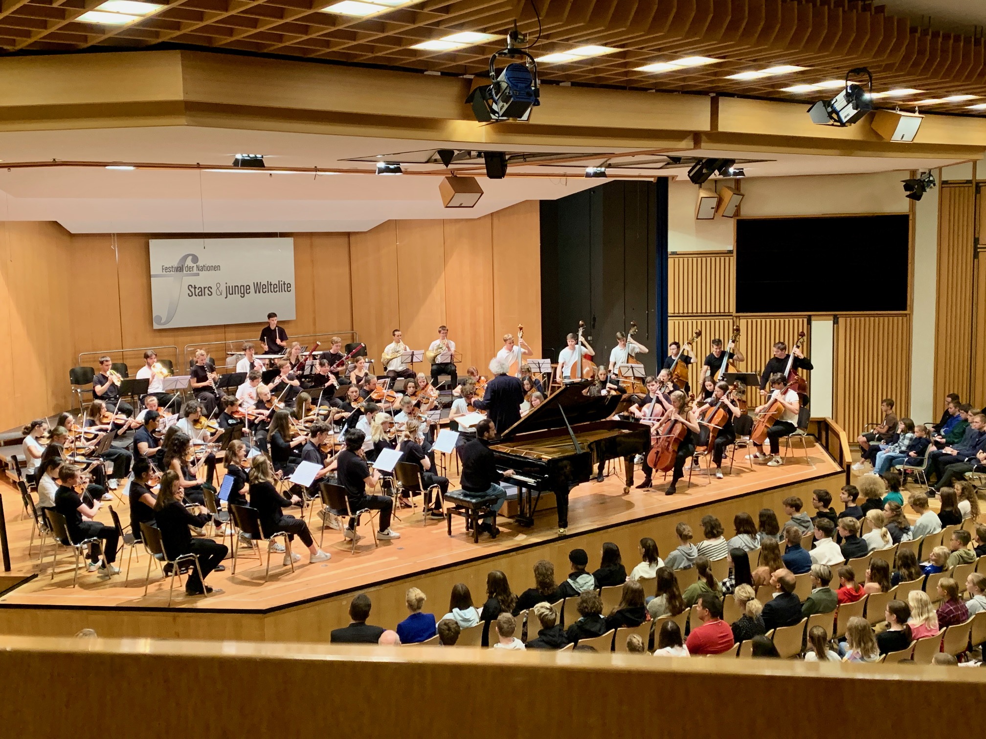 90 MusikerInnen der Chöre und Orchester des Vöhlin-Gymnasiums besuchten am vergangenen Freitag "das große Schulkonzert" in Bad Wörishofen. Dort spielte der weltweit gefeierte Pianist Igor Levit gemeinsam mit dem "vbw Festivalorchester" das Klavierkonzert Nr. 5 "Emperor" von Ludwig van Beethoven. Levit gab bei Interviews Einblicke in das Werk und verriet, was ihn als Solisten in der Corona-Zeit rettete. Die jungen Orchesterspieler im Alter von 11-17 Jahren musizierten auf einem erstaunlich hohen Niveau. Da lauschten die rund 700 SchülerInnen aus ganz Schwaben, von denen die meisten selbst aktive Musiker sind, und ließen sich in den Bann der schnellen und von Stimmungswechseln geladenen Musik Beethovens ziehen.